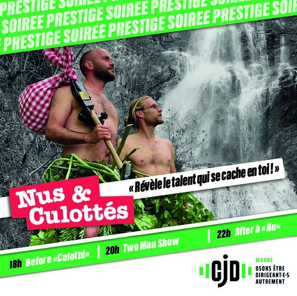 Cette année, le Centre des Jeunes Dirigeants de la Marne prend le parti de l'audace. Oubliez les conférences classiques, venez participer à un vrai électrochoc d'optimisme et d'ingéniosité avec Nans & Mouts de Nus&Culottés. "Se mettre à poil" de ses habitudes / Activer l'intelligence situationnelle / Passer de l'orientation subie au choix pro-actif. Une soirée en trois temps, sélectionnez vos options "Before Culotté" et/ou "After à Nu" après avoir validé vos places au Two Man Show.